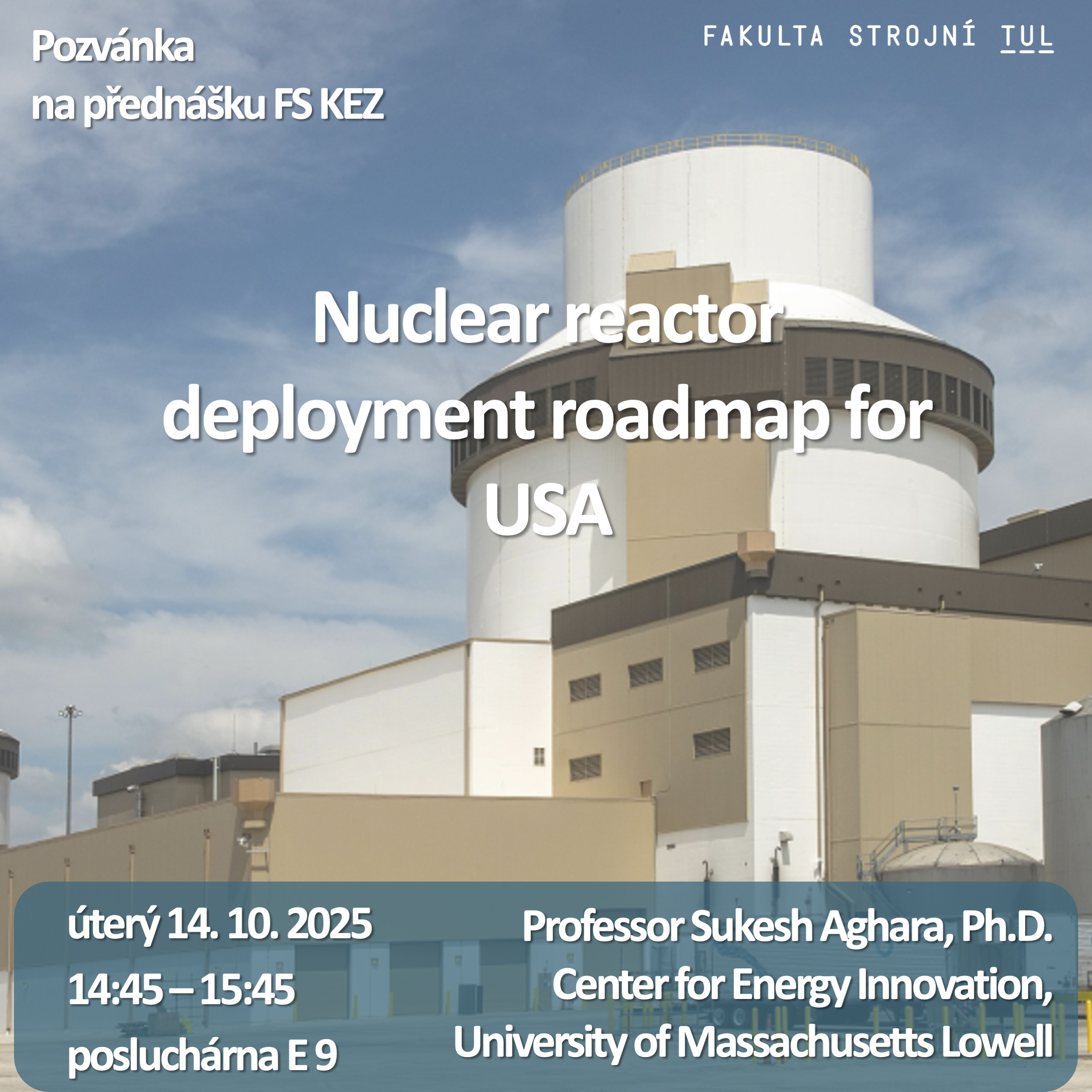 Dne 14. října 2025 se od 14:45 do 15:45 v posluchárně E9 uskuteční přednáška „Nuclear reactor deployment roadmap for USA“. Na Katedře energetických zařízení Fakulty strojní TUL přivítáme profesora Sukeshe Agharu, Ph.D. z University of Massachusetts Lowell, který působí v Center for Energy Innovation. Přednáška nabídne pohled na současný vývoj a plány rozvoje jaderných reaktorů ve Spojených státech amerických a poskytne inspirativní přehled o aktuálních trendech v jaderné energetice a výstavbě nových zdrojů.