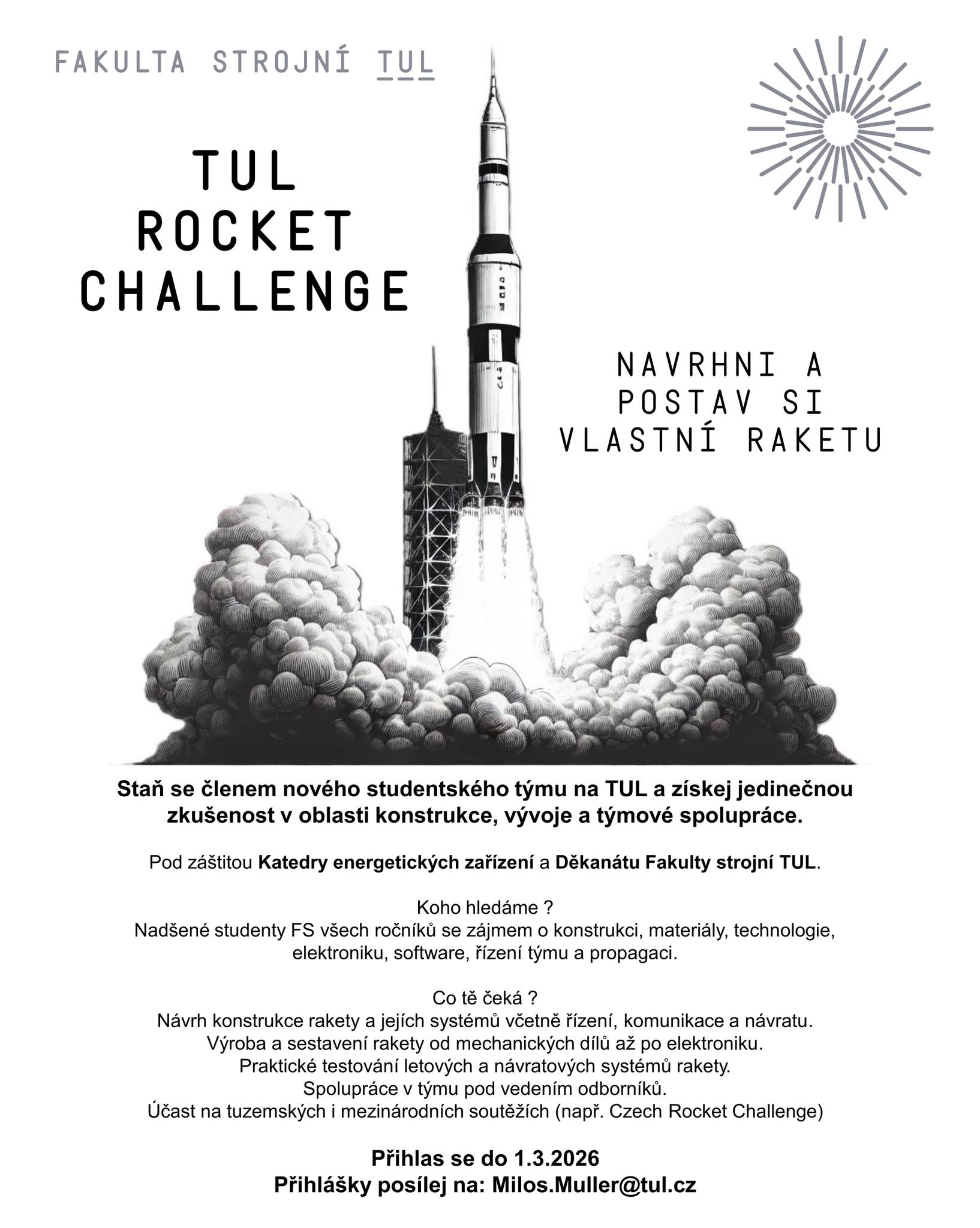 Pod záštitou Katedry energetických zařízení vzniká na fakultě něco nového – rozjíždíme studentský tým TUL Rocket Challenge, který si navrhne a postaví vlastní raketu. Hledáme studenty, kteří chtějí dělat víc než jen splnit povinnosti do školy: uplatnit se v praxi, získat nové zkušenosti a být součástí týmu, kde je vidět reálný výsledek práce. Zapojit se můžete do celého procesu vývoje – od prvních návrhů až po testování = návrh konstrukce rakety a jejích systémů, řízení, komunikace a návratové prvky, výroba a integrace jednotlivých částí, praktické testování. Pracovat budete v týmu, kde se naučíte spolupráci, plánování i technické rozhodování, a zároveň budete mít vedení a podporu odborníků. Součástí aktivity je i možnost účastnit se tuzemských i mezinárodních soutěží. Pokud Vás nabídka zaujala, přihlaste se prosím do 1. 3. 2026 na e-mail: milos.muller@tul.cz.